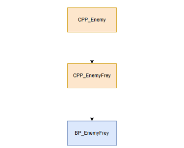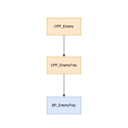 The enemy structure in this case is quite simple. We use a CPP_Enemy C++ base class, and a CPP_EnemyFrey C++ class that contains all the core logic for the enemy Frey. CPP_EnemyFrey inherits from CPP_Enemy. The visual aspects of the character (mesh, skeleton, effects, etc.) are handled in the BP_EnemyFrey blueprint class, which inherits from the CPP_EnemyFrey C++ class. In the image, orange boxes represent the C++ classes, while blue boxes represent the Blueprint classes.