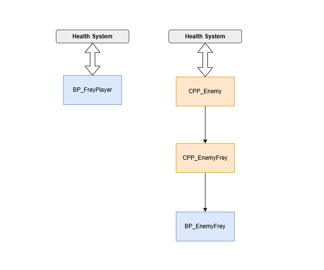 The health system is fully implemented in C++. The Frey player character connects to this system via Blueprints, as it is a class entirely implemented in Blueprints. On the other hand, the enemy Frey connects to the system through C++.