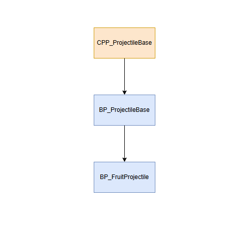 The player character and the enemy both throw a projectile. This projectile has a C++ base class called CPP_ProjectileBase, along with two Blueprint classes: BP_ProjectileBase and BP_FruitProjectile, where the visual aspects of the projectile, such as the mesh, are implemented. The BP_ProjectileBase class is used to spawn the visual and sound effects. The CPP_ProjectileBase class contains the core logic, such as the velocity variable. While the CPP_ProjectileBase class is not central, it is useful for handling the projectile reference in C++